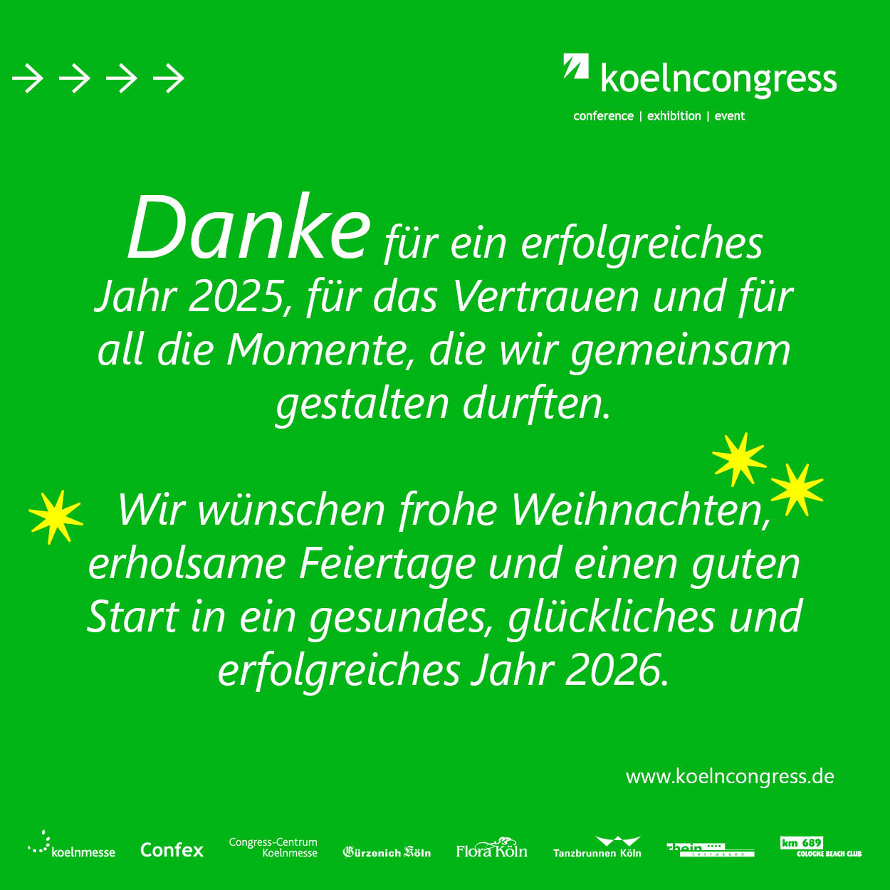 In unseren Locations sind Menschen zusammengekommen, Visionen wurden zum Leben erweckt und es wurden einzigartige Erlebnisse geschaffen. Danke für ein tolles Jahr 2025 und wir freuen uns auf alles, was 2026 gemeinsam vor uns liegt!