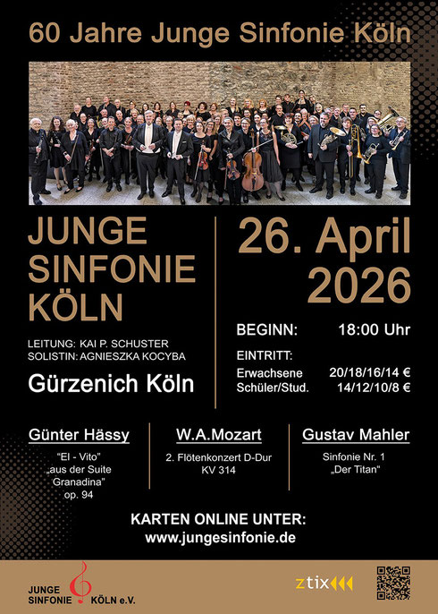 Die Junge Sinfonie Köln (JSK) feiert ihr 60-jähriges Jubiläum mit einem ganz besonderen Geburtstagskonzert. Mit Gustav Mahlers Symphonie Nr. 1 steht ein Werk auf dem Programm, das mit höchsten technischen und musikalischen Anforderungen jedes Orchester an seine Grenzen führt und mit einer Besetzung von 90 Musiker*Innen die Dimensionen der Symphonik voll auskostet. Der Beiname „Der Titan“ ist Programm und ein gefundenes Fressen für die JSK, die mit ihrem Dirigenten Kai P. Schuster das ideale Paar für spätromantische Gipfelstürme ist! Flankiert wird dieses epische symphonische Drama abwechslungsreich von dem freudestrahlenden zweiten Flötenkonzert von Mozart und von Orchestergründer Günther Hässys temperamentvoller Komposition „El Vito“. Zu Beginn lässt die JSK einen leidenschaftlichen Feuersturm durch den Saal toben, bevor Agnieszka Kocyba mit einmalig farbenreichem Ton und Virtuosität das Solokonzert vibrieren lässt.